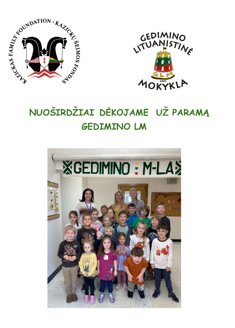 Nuoširdžiai dėkojame Kazickų Šeimos fondui kuris, pagal Aleksandros Kazickienės paramos lituanistinėms mokykloms programą , Gedimino lituanistinei mokyklai paskyrė 5,000 USD paramą mokyklos patalpų nuomos išlaidoms susimokėti.