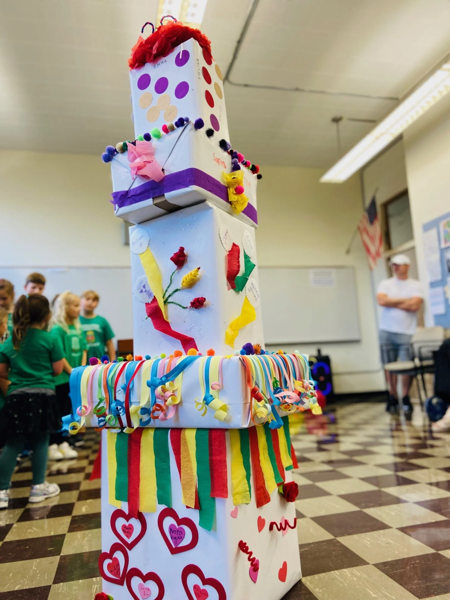 Mokyklos vadovė Erika Kuzmin kiekvienam mokiniui ir visoms mokytojoms įteikė po žaislinį gandrą taip simboliškai palinkėdama rudenį sugrįžti į mokyklą, kaip gandrai visada sugrįžta namo.