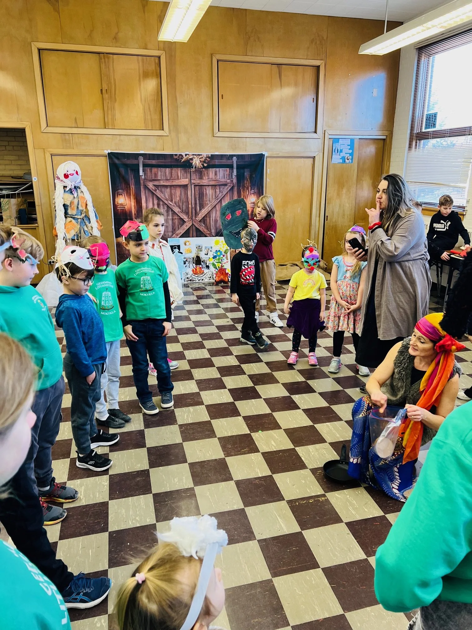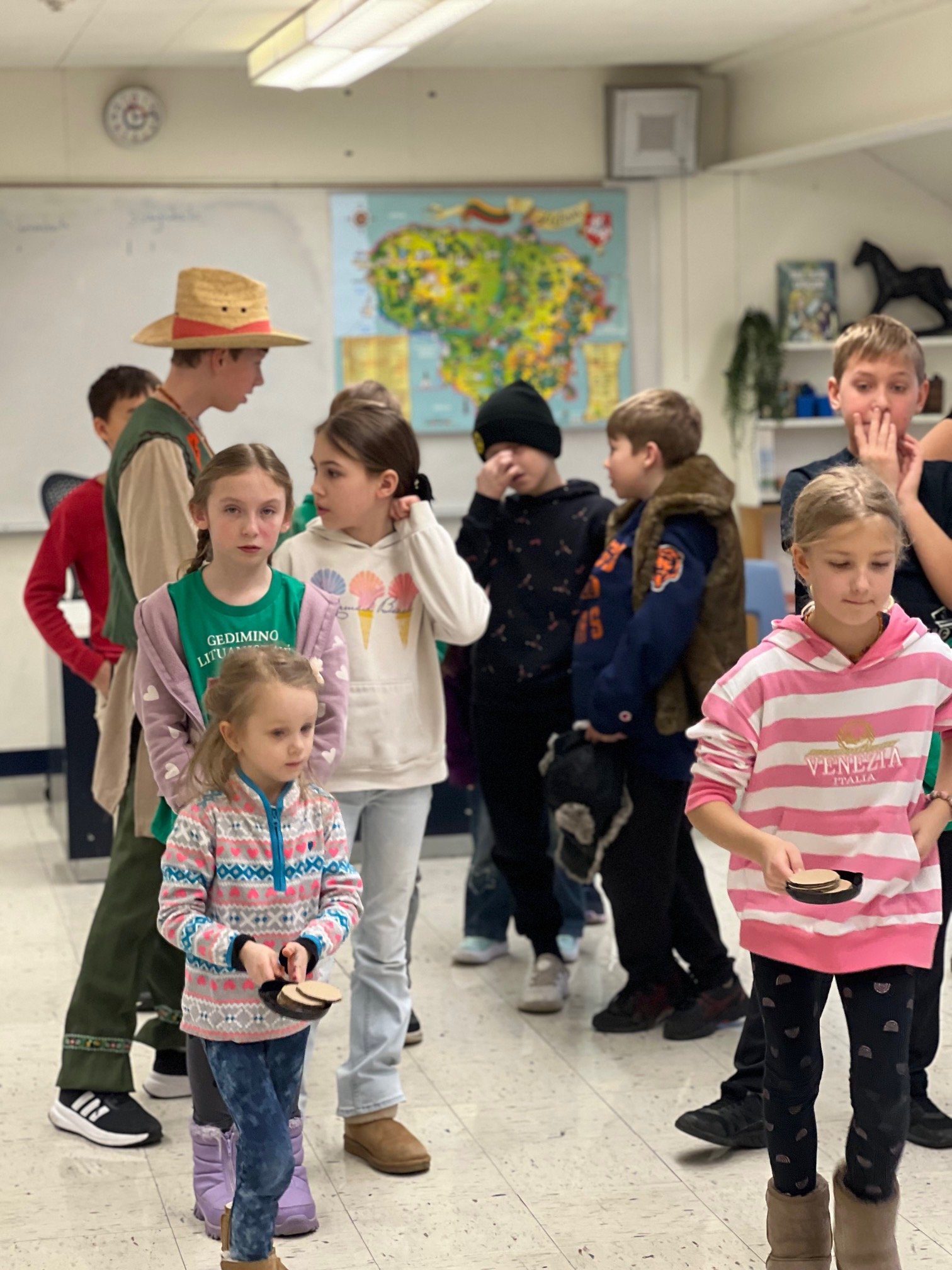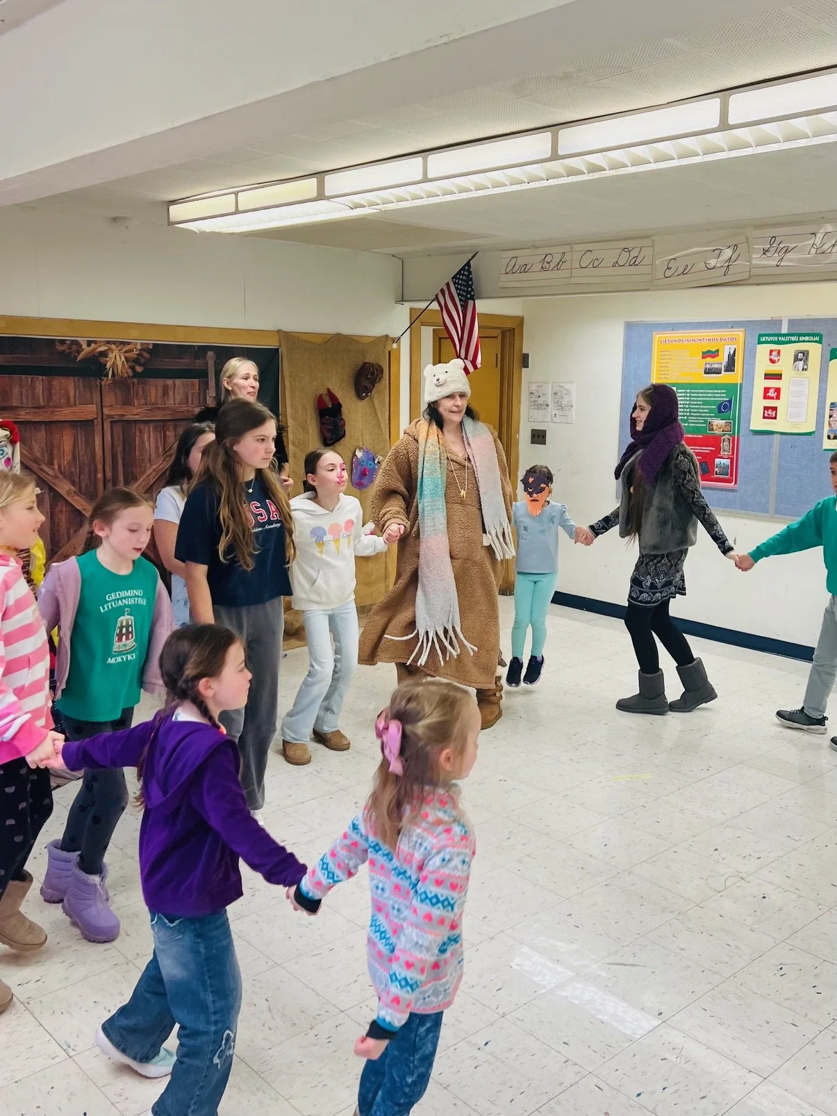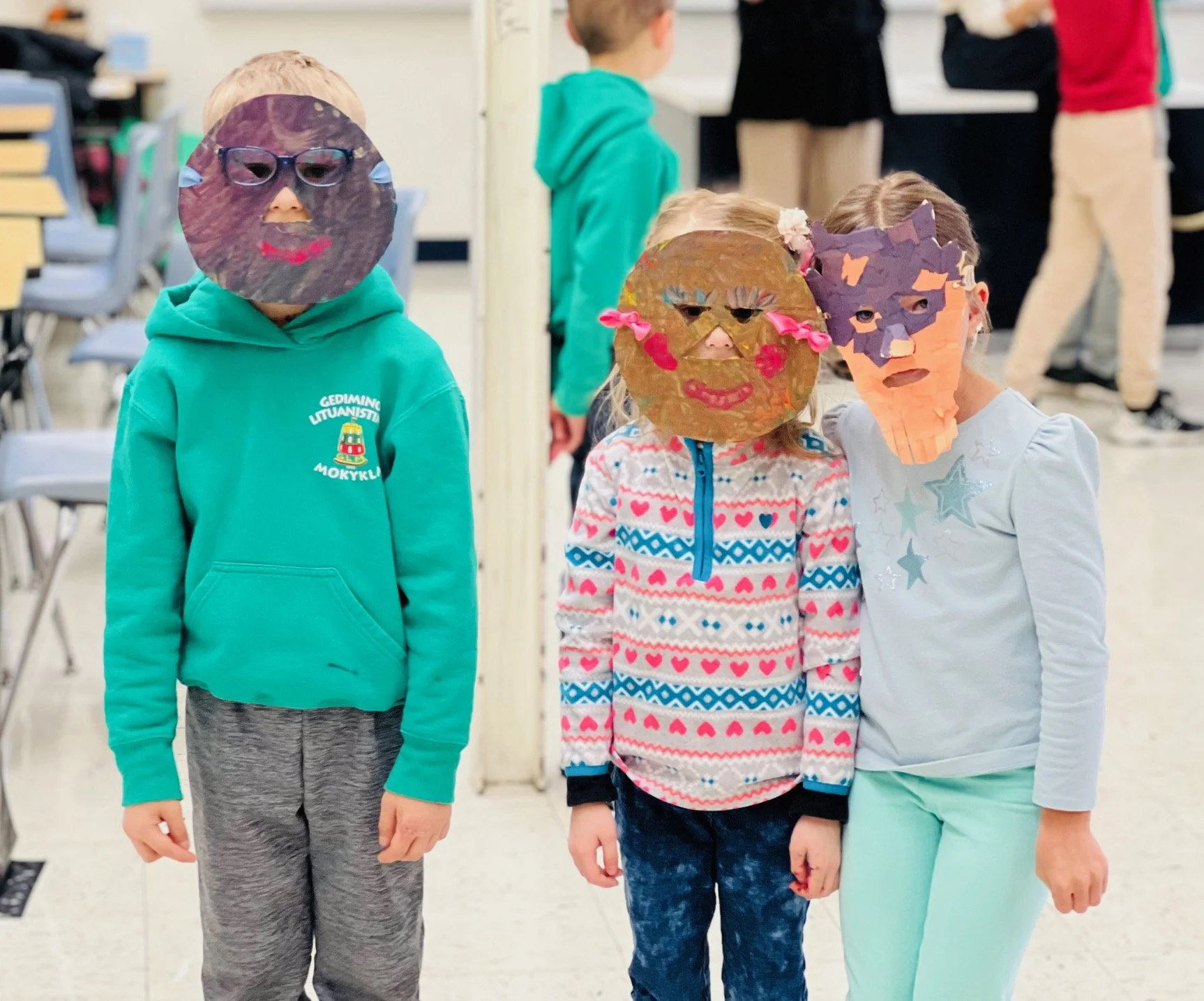 Šiandien mokykloje linksmai šventėme Užgavėnes — šventę, kurios mokiniai laukia kiekvienais metais. Čikagoje šią žiemą tikrai netrūko sniego ir šalčio, todėl visi jau labai pasiilgome pavasario. Tad pats laikas žiemą išvaryti: „Žiema, žiema, bėk iš kiemo!“