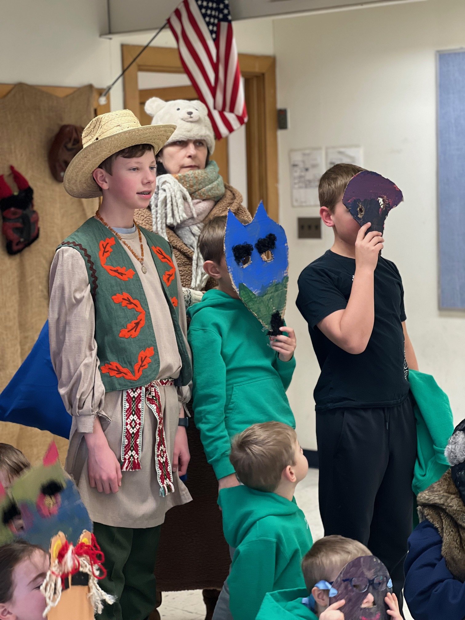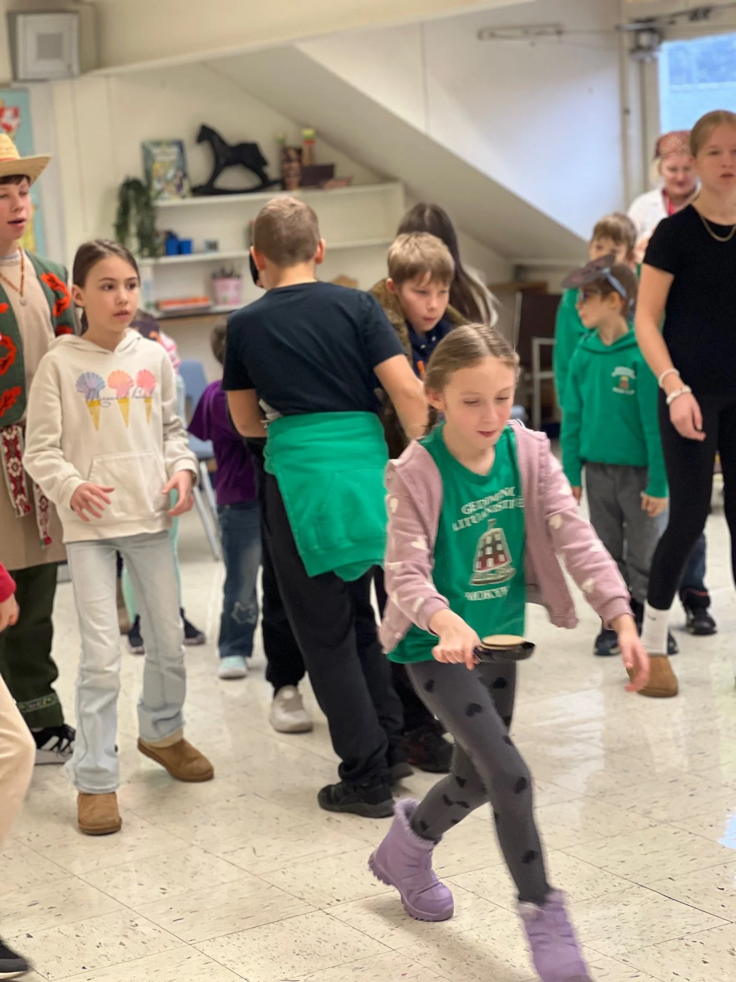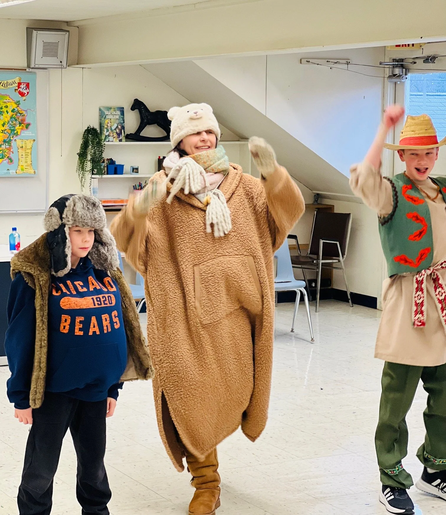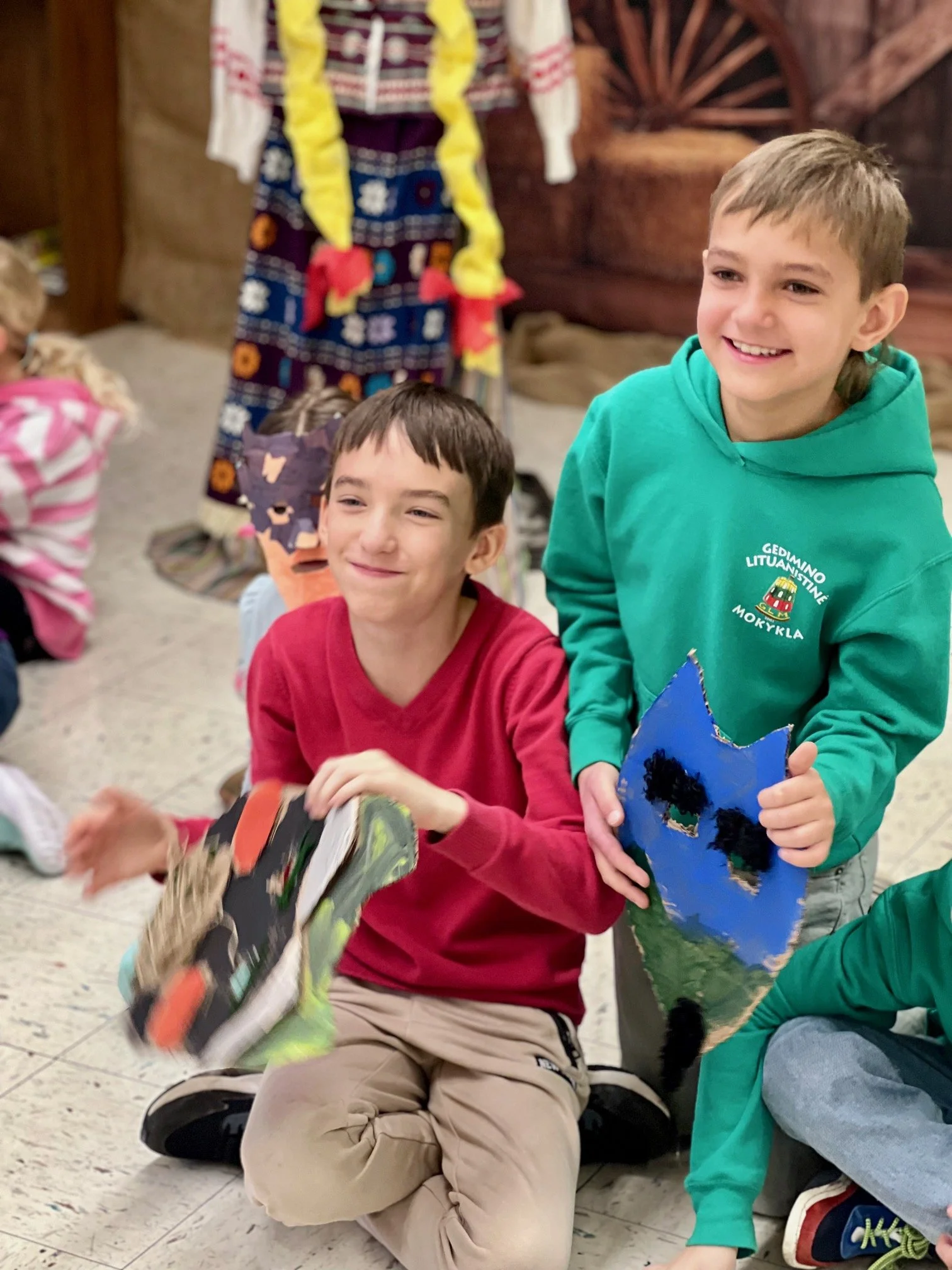 Šiandien mokykloje linksmai šventėme Užgavėnes — šventę, kurios mokiniai laukia kiekvienais metais. Čikagoje šią žiemą tikrai netrūko sniego ir šalčio, todėl visi jau labai pasiilgome pavasario. Tad pats laikas žiemą išvaryti: „Žiema, žiema, bėk iš kiemo!“