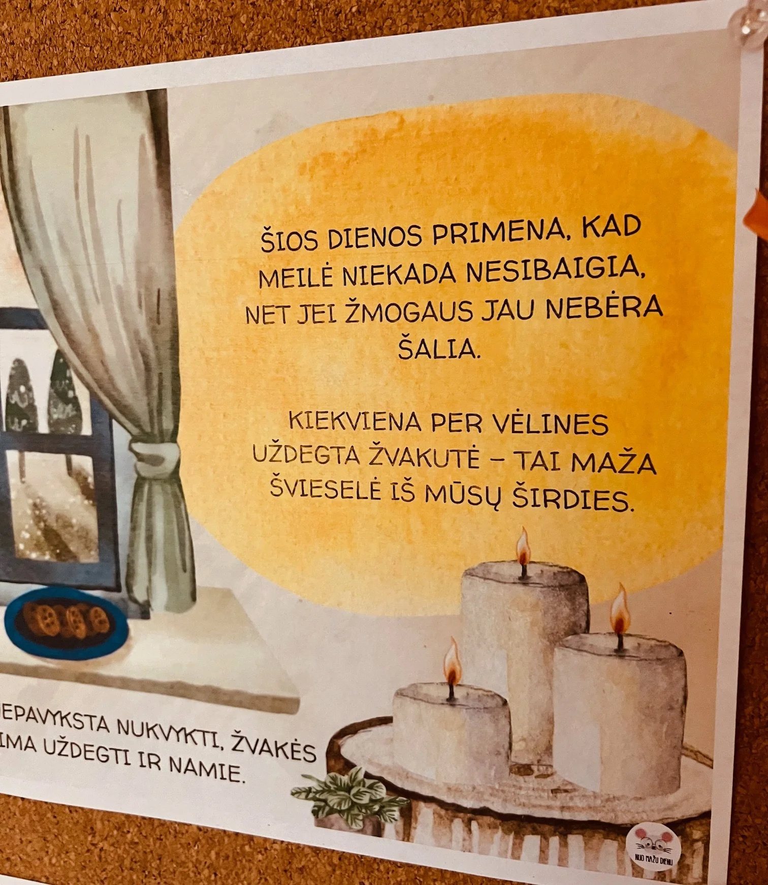 Lapkričio 1d. Vėlinių diena buvo paminėta ir mūsų mokykloje. Mokiniai uždegė žvakutes, mokytojos papasakojo apie šios dienos svarbą ir tradicijas, simboliškai mokiniai pagamino angeliukus ir juos pakabino ant mokyklos stendo.