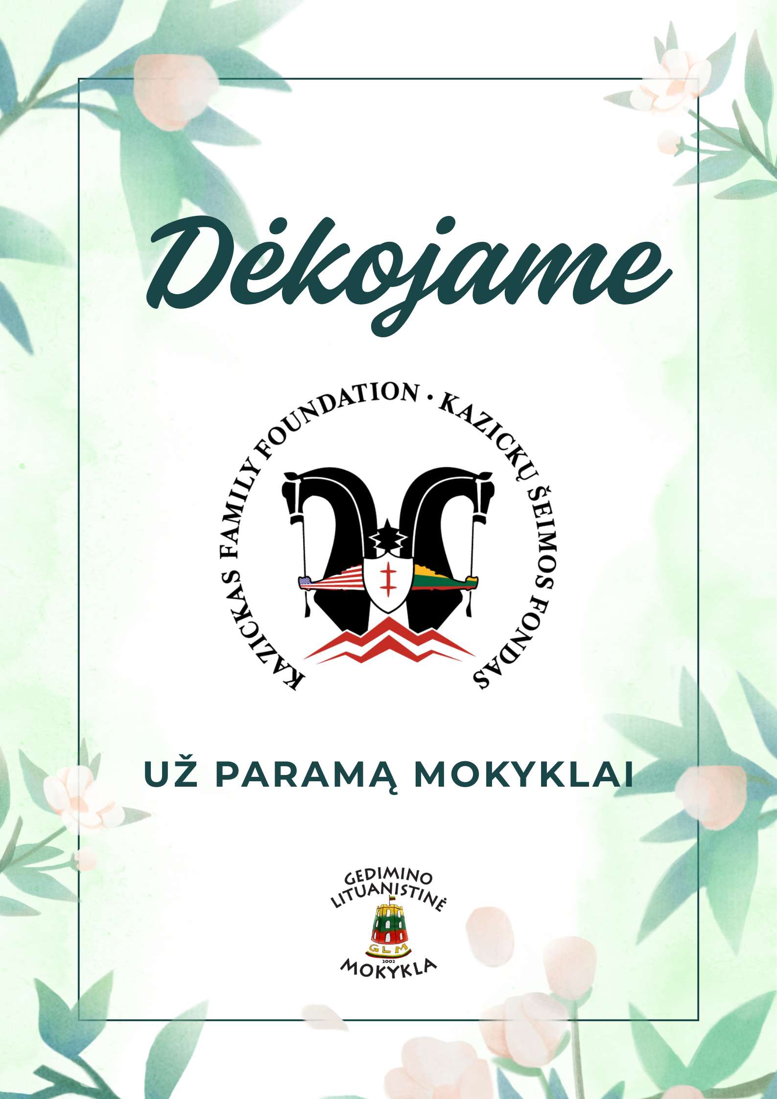 Nuoširdžiai dėkojame Kazickų šeimos fondui už skirtą 4 000 USD finansinę paramą, kuri padės padengti dalį mokyklos nuomos.